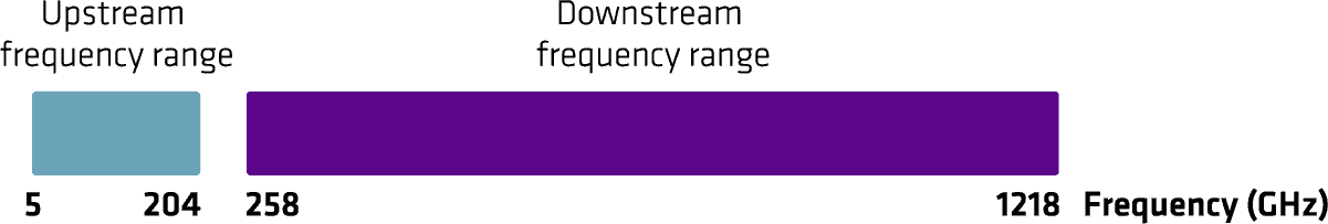 DOCSIS 3.1 uses more spectrum than previous versions of DOCSIS with downstream frequency ranges up to 1218 MHz and upstream frequency ranges up to 204 MHz. Up/down frequency split is relatively flexible (sub-, mid- or high split), supporting a growth strategy with a high split of 204/258 MHz being possible.